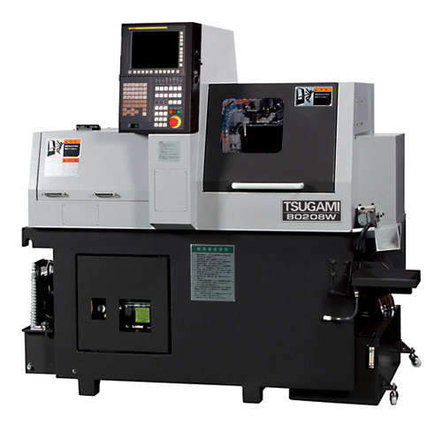 B0208W采用3系统同时控制,各刀台独立控制,实现正背面同时进行的多样化加工;3系统控制,换刀时间零化;3刀台搭载Y轴,背轴侧Y轴,可以实现更高附加值零件的加工;软件方式热变补偿,实现高精度加工。