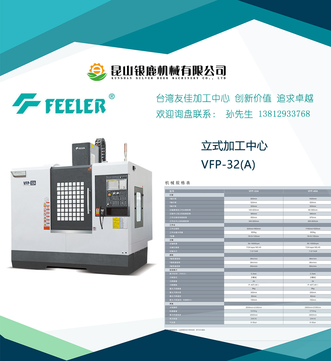 友嘉VFP-40A2线1硬1米立加一级代理。台湾友嘉VFP-40A立加在老款基础上进行了升级、立柱加大加宽为A字结构、同时保持发那科a电机使用、搭配1包系统、在力道上以及拐角加工中能够获得比较好的加工效果。X、Y轴采用线轨,Z轴为硬轨,中和了刚性和速度,专业的技术设计保证了,长时间使用主轴头不会变形弯曲。主轴采用浮动打刀设计,保护主轴换刀不受冲击、延长了主轴轴承使用寿命及保障了主轴精度!在一般产品加工中可以获得较好的加工效果。如果选配升级安装模具包,亦可进行模具高速高精加工。是一款综合性能比较好的加工中心。故障率低、使用皮实可靠!图片外形和VFP-32A几乎一致、仅供参考!如果需要可以预约工厂现场看设备。